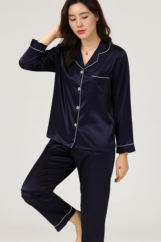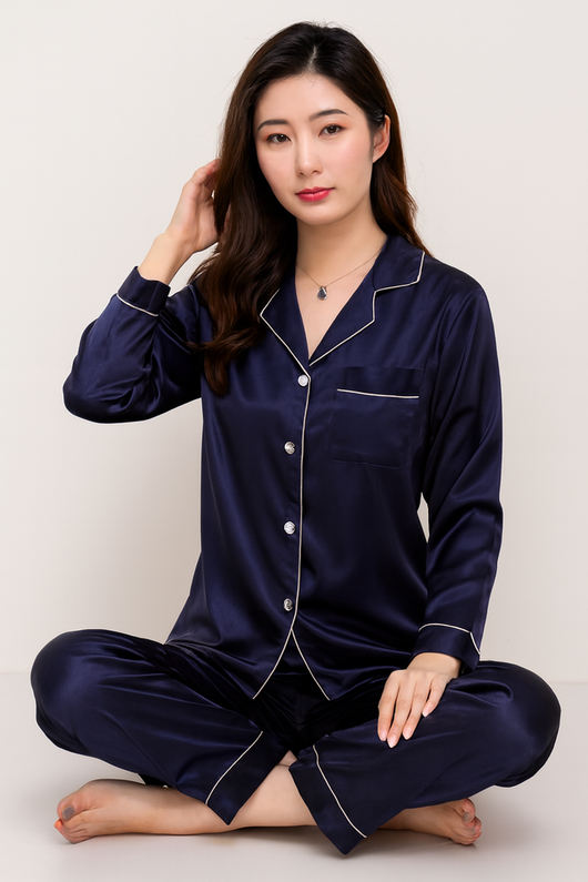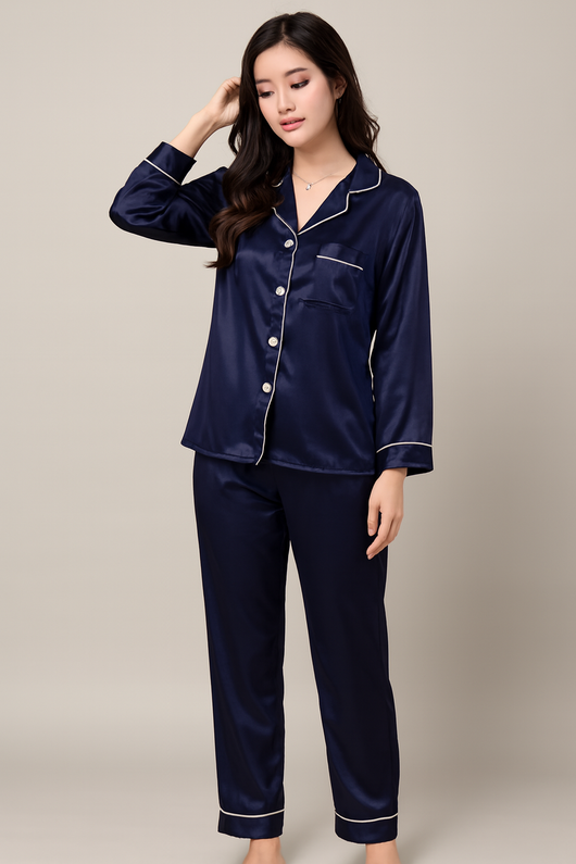Unwind in understated luxury with our Midnight Calm satin pajama set. This deep navy ensemble is accented with crisp white piping, highlighting the classic button-down top and relaxed-fit trousers. The silky fabric offers a gentle glide against the skin, while the minimalist styling ensures timeless appeal. Whether you're embracing a quiet evening or curating a refined loungewear edit, this set delivers comfort with poise.